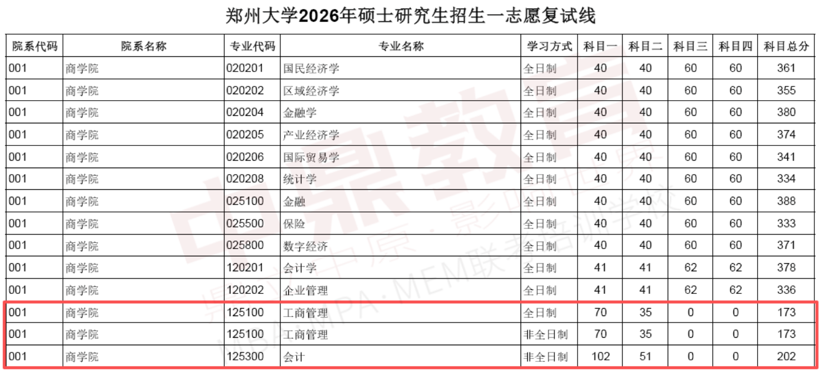郑州大学2026年MBA/MPA/MEM/MPAcc等专业复试分数线已经公布,其中:MBA复试线为173/35/70MPA复试线为191/40/80MEM(工程管理)复试线为169/45/100物流工程与管理复试线为227/45/400工业