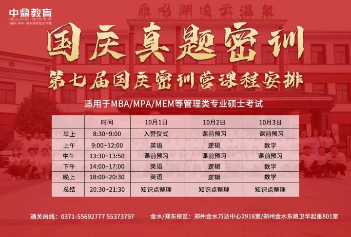 二十年资历,汇聚独特的“全程一线师资授课+独有的密训课程+独有的必考点专项特训课程+手机APP随时学习直播课堂+360无忧补课系统—网络课程+ 管家式服务+学习计划制定+一对一指导+复试录取绿色通道+MBA学员俱乐部资源共享”的培训特色,缔造郑州MBA联考辅导卓越品牌。