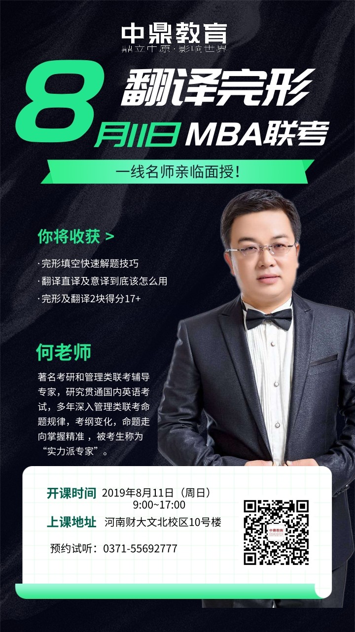 7、2019年8月25日(周日)9:00-17:00MBA英语二作文部分怎么做到未雨绸缪??如何做到轻松得8分?关注中鼎MBA辅导中心微信号即可享受免费试听半天课程!