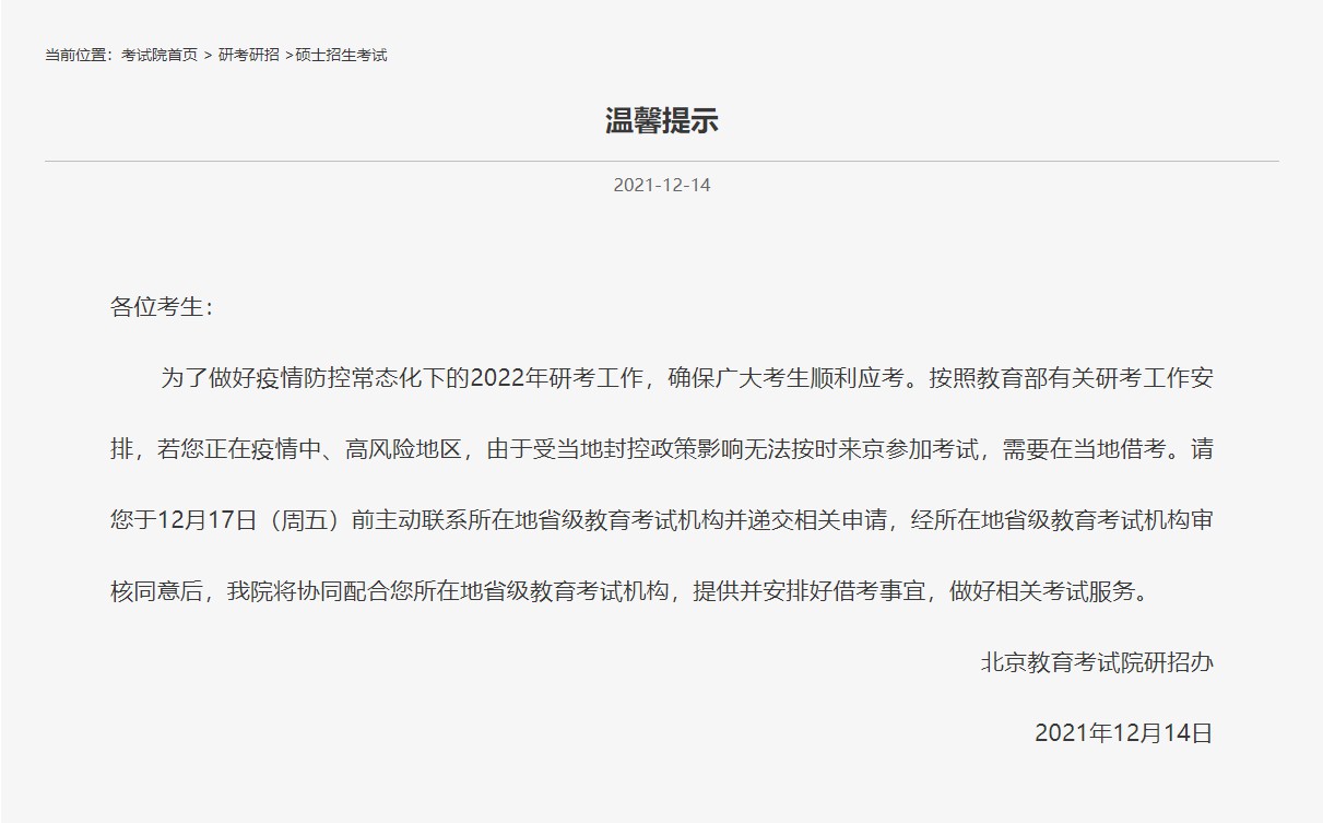 近期多个省市进行了官宣,允许临时更改考点,这种情况在考研史上还是第一次出现,可以说是非常照顾考生啦!北京 该部分考生要于12月17日(周五)前并递交相关申请。河南 因所在区域被封控无法前往报考点参加考试,请尽快联系